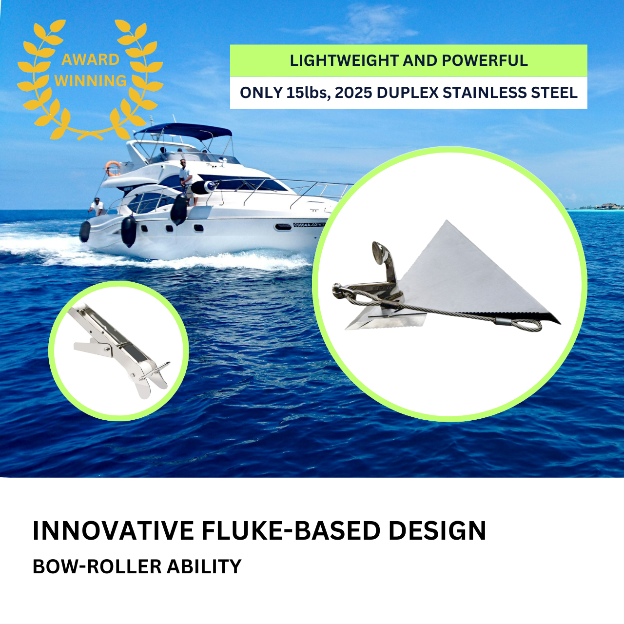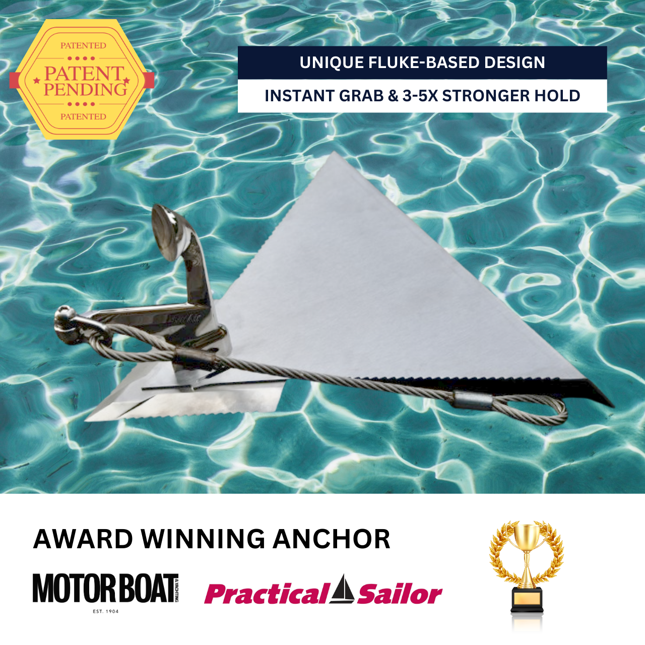 An anchor’s weight is the least important factor for how well it sets or holds. The key is the size of the fluke or its surface area. The XYZ Air Anchor has a 1250cm² fluke, which is 2-5 times bigger than others of similar size.