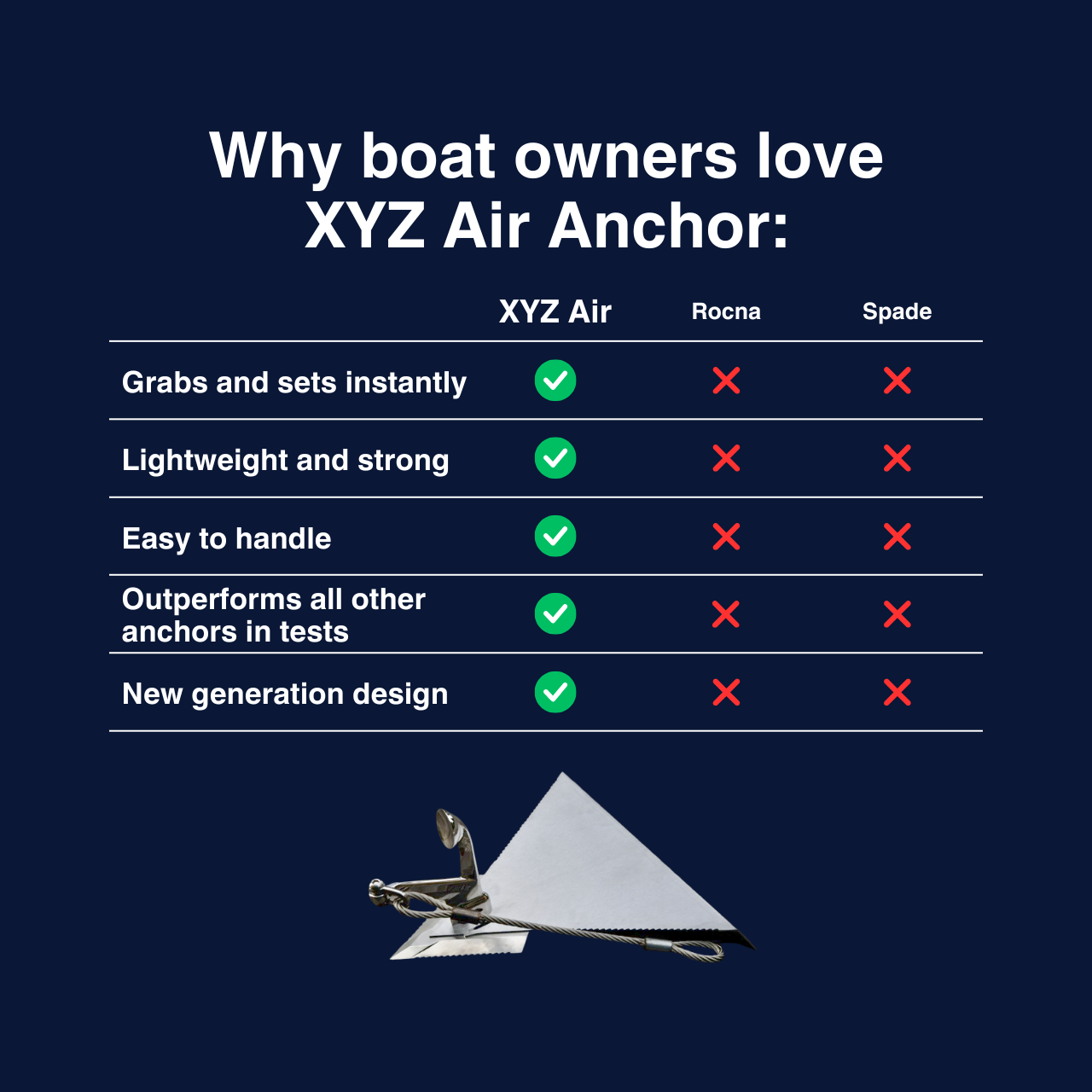 XYZ Air Anchor is made for the most extreme weather conditions, producing a reliable anchor that helps keep your boat and family safe in all weather conditions.